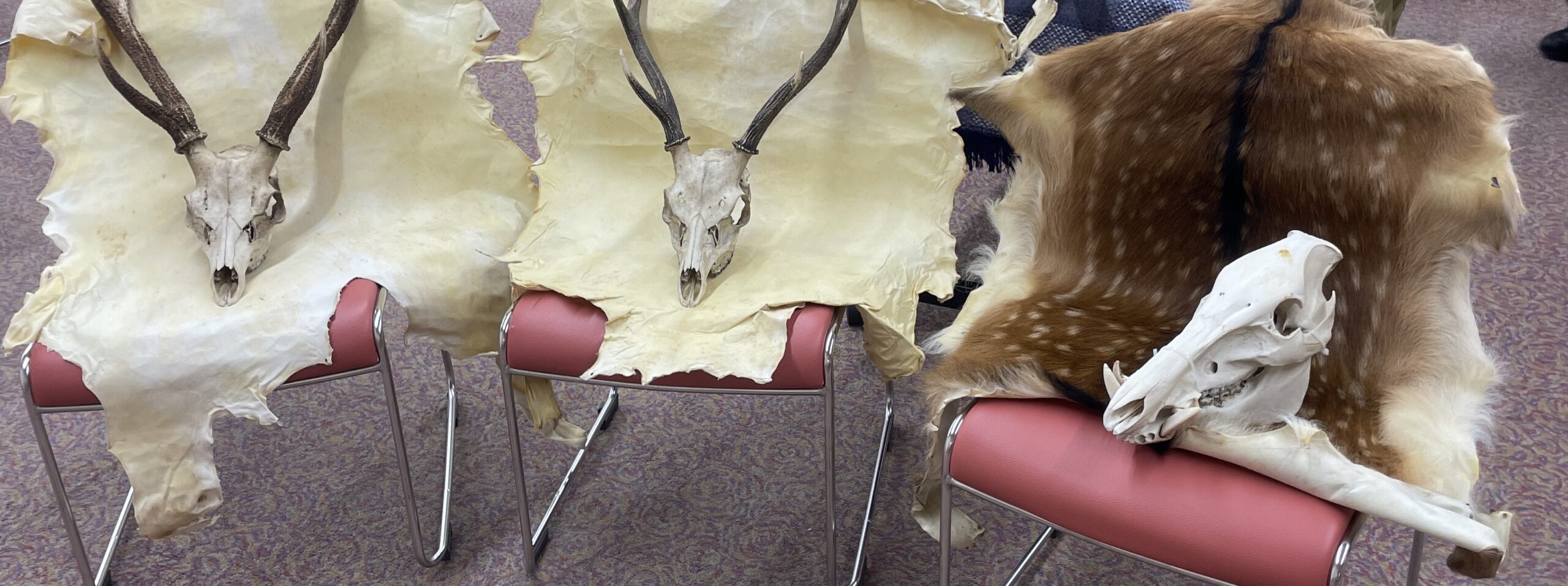 狩猟免許取得相談コーナーや、狩猟体験(VR)、シカやイノシシの頭蓋骨